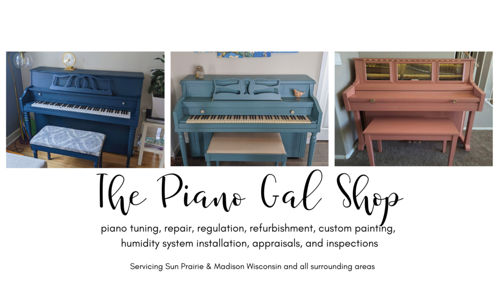 Welcome to The Piano Gal Shop! Owner, Marta Hansen, is a skilled piano tuner/technician and has been servicing pianos in the Sun Prairie, Madison, and surrounding areas for over 13 years. To book a piano tuning appointment, use the handy online booking tool. Piano services include: tuning, repair, refurbishment, cleaning, regulation, humidity system installation, custom painting, custom updates, and upcycling.
